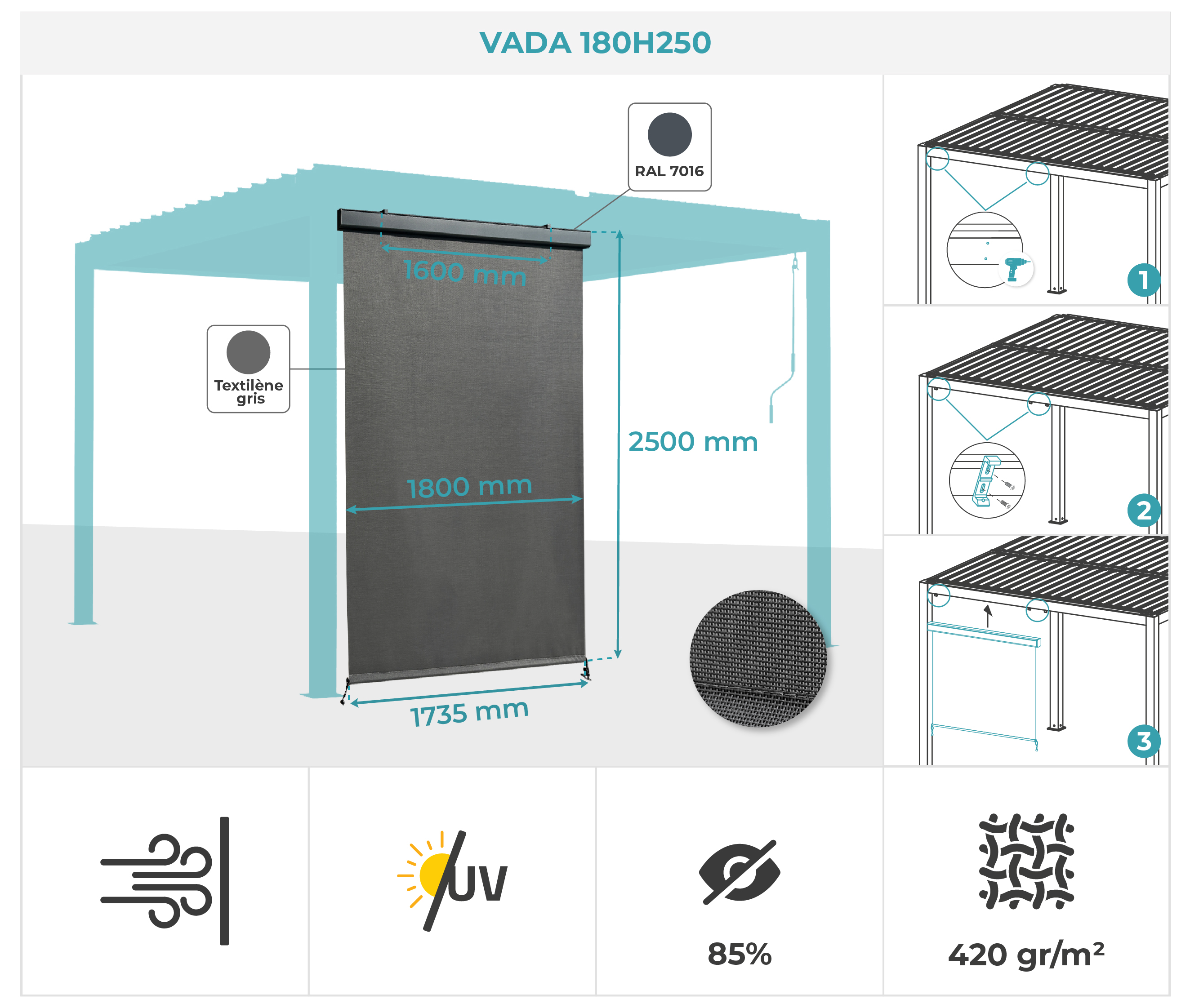 Accessoirisez votre pergola avec le store pour pergola VADA, conçu pour s’adapter aux pergolas PIANA, AGOSTA et SANTA tout en apportant confort, protection et esthétisme. Ces stores extérieurs verticaux permettent de personnaliser votre espace selon vos besoins et peuvent également convenir à d’autres modèles de pergolas, sous réserve de dimensions compatibles. Leur structure en aluminium gris anthracite assure une intégration élégante et moderne.